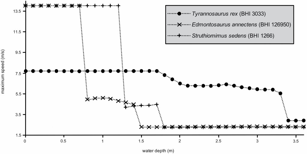 Lorsque Tyrannosaurus, Edmontosaurus et Struthiomimus pataugent dans le mode de locomotion I, leur vitesse est quasi identique à leur vitesse à terre. Tyrannosaurus était alors plus lent que ses proies si les deux pataugeaient. Toutefois, à partir du mode de locomotion II, les vitesses d’Edmontosaurus et Struthiomimus baissent drastiquement, passant respectivement à 15-18 km/h et 15-16 km/h. Pour le mode II, la vitesse de Tyrannosaurus baisse aussi, mais beaucoup moins et passe à 20-23 km/h. Aux modes III et IV, les vitesses de ces trois dinosaures baissent encore, mais Tyrannosaurus reste plus rapide. En plus d’être plus rapide que ses proies à partir du pataugeage, avec le corps axial partiellement immergé dans l’eau, Tyrannosaurus met plus de temps à changer de mode de locomotion car ses membres postérieurs sont plus grands.