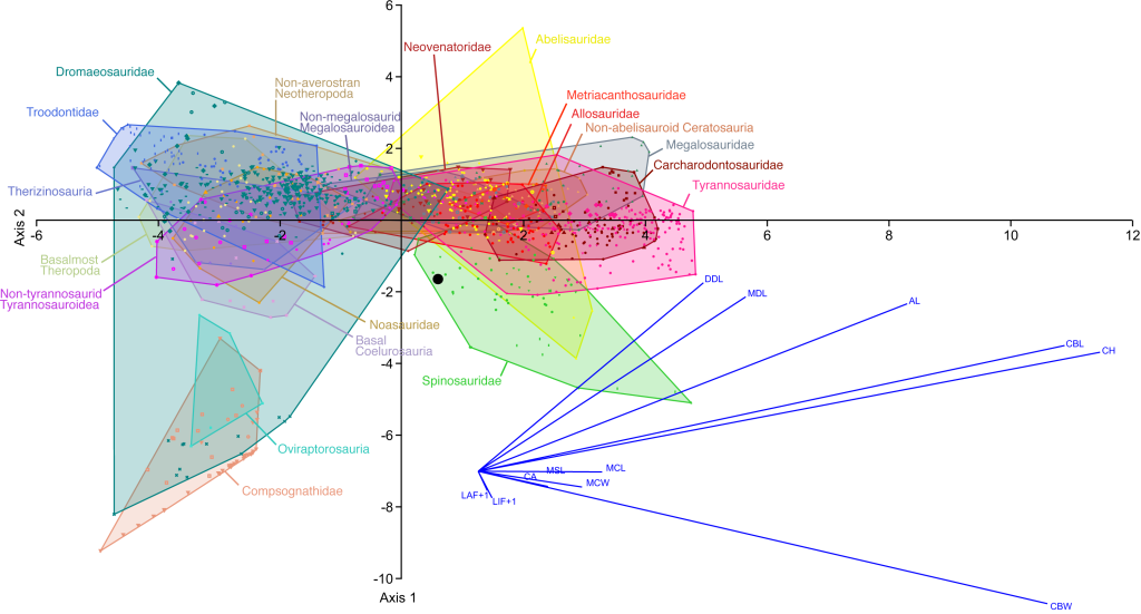 Pour tester et consolider leurs résultats, Barker et ses collègues ont également placé HASMG G369a dans des analyses morphométriques. Ces analyses définissent les morphospaces dentaires des différents clades de théropodes ainsi que des différentes espèces de spinosauridés. Il en résulte que HASMG G369a se retrouve dans le morphospace des spinosauridés et qu’il se trouve isolé parmi les morphospaces des différentes espèces de spinosauridés. Barker et ses collègues consolident ainsi l’attribution de HASMG G369a à Spinosauridae ainsi que sa considération en tant que taxon distinct.