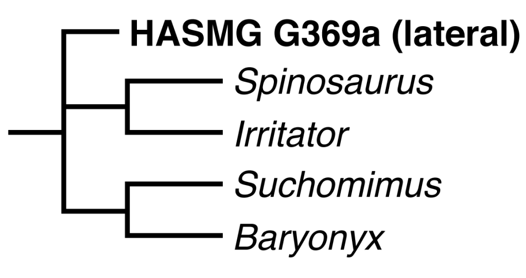 Le spécimen décrit par Barker et ses collègues est une dent isolée (HASMG G369a), qui préserve la couronne sans son apex et la partie basale de sa racine. La morphologie de cette dent la rend attribuable sans aucun doute à Spinosauridae. Barker et ses collègues ont réalisé une analyse phylogénétique afin de savoir si HASMG G369a représentait un taxon distinct ou bien appartenait à une espèce déjà connue. Il en résulte que cette dent n’est proche d’aucune espèce de spinosauridé en particulier. HASMG G369a représente probablement un nouveau taxon, mais ce spécimen est insuffisant pour recevoir un nom. Barker et ses collègues l’ont donc référé à Spinosauridae indet.