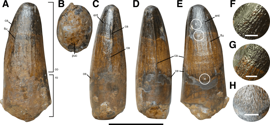 Référence : Barker, C.T.; Naish, D.; Gostling, N.J., 2023, Isolated tooth reveals hidden spinosaurid dinosaur diversity in the British Wealden Supergroup (Lower Cretaceous). PeerJ. 11: e15453.