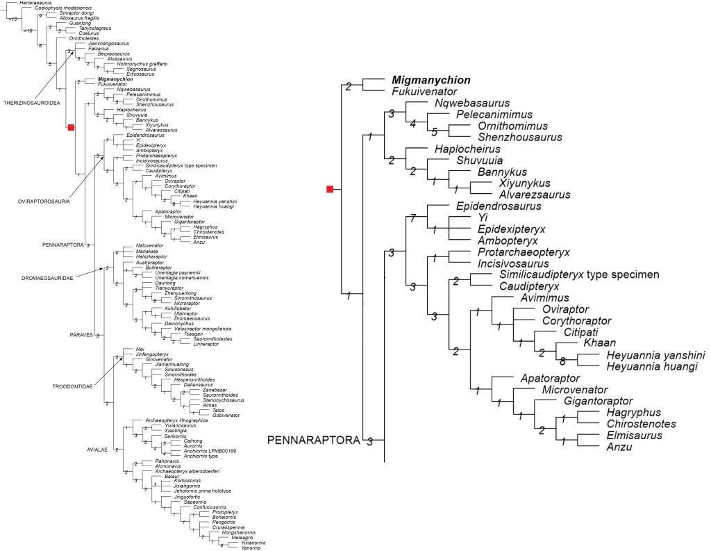 L’analyse phylogénétique réalisée par Wang et ses collègues a placé Migmanychion comme taxon-soeur de Fukuivenator, les deux genres formant un clade de Maniraptora plus proche de Pennaraptora que de Therizinosauria. Wang et ses collègues souhaitent toutefois rester prudents, car l’holotype de Migmanychion comporte peu d’éléments. De nouveaux spécimens de ce genre sont susceptibles d’affecter son classement et de mettre en doute sa relation étroite avec Fukuivenator. Il est donc prudent mais justifié de considérer Migmanychion comme un Maniraptora indéterminé.