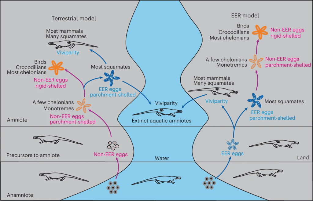 Pour Jiang et ses collègues, les premiers amniotes ont développé la viviparité à partir de l’œuf EER de leurs ancêtres. Par la suite, l’oviparité s’est développée chez plusieurs clades mais la majorité des mammifères, certains squamates et certains sauropsides aquatiques ont conservé cette viviparité ancestrale. Certains lepidosaures ont développé des œufs à la coquille parcheminée, en perdant parfois l’EER. Les mammifères monotrèmes ont également perdu l’EER tout en développant des œufs à coquille membranaire.
