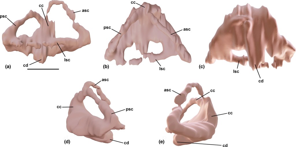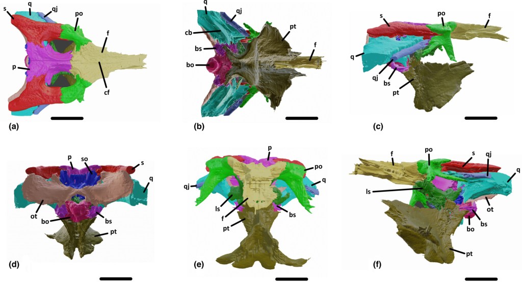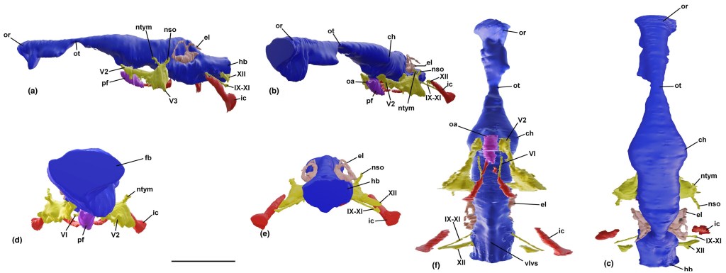 Référence : Pochat-Cottilloux, Y.; Rinder, N.; Perrichon, G.; Adrien, J.; Amiot, R.; Hua, S.; Martin, J.E., 2023, The neuroanatomy and pneumaticity of Hamadasuchus (Crocodylomorpha, Peirosauridae) from the Cretaceous of Morocco and its paleoecological significance for altirostral forms. Journal of Anatomy.