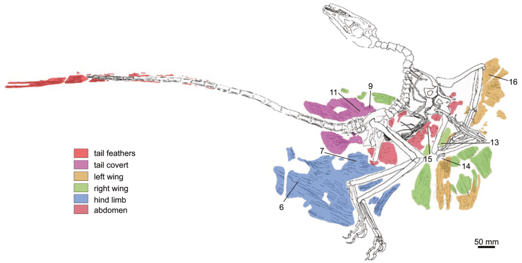 Croudace et ses collègues ont analysé 16 échantillons de plumage, au niveau des membres et de l’abdomen. Ils ont identifié des mélanosomes dans huit d’entre eux, avec trois morphotypes distincts. Il y a des mélanosomes larges et oblongs, des mélanosomes étroits et allongés et finalement des mélanosomes petits et ovoïdes. Croudace et ses collègues ont identifié les couleurs correspondant à ces mélanosomes sur la base de plusieurs bases de données. Ils en concluent que les mélanosomes larges et oblongs correspondent au gris, les mélanosomes étroits et allongés correspondent à l’iridescence et finalement les mélanosomes petits et ovoïdes correspondent au gris-marron.