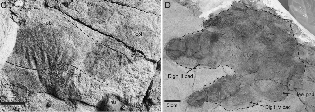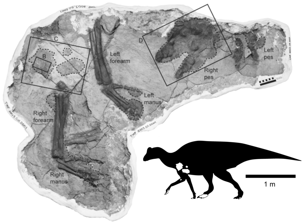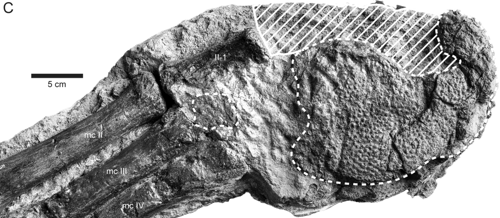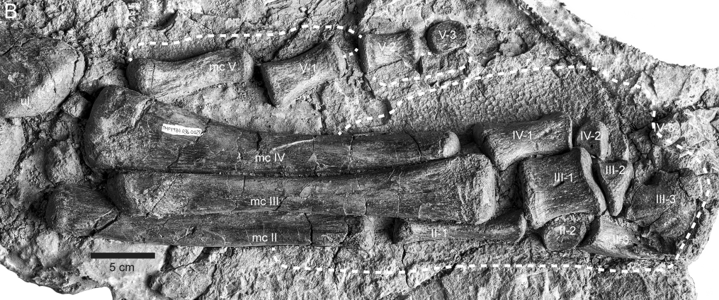 Référence : Joubarne, T.; Therrien, F.; Zelenitsky, D.K., 2023, Integumentary impressions on hadrosaurid specimens from the Upper Cretaceous (upper Campanian) Dinosaur Park Formation, Alberta, Canada: implications for integument patterns and hand morphology. Journal of Vertebrate Paleontology. e2213287.