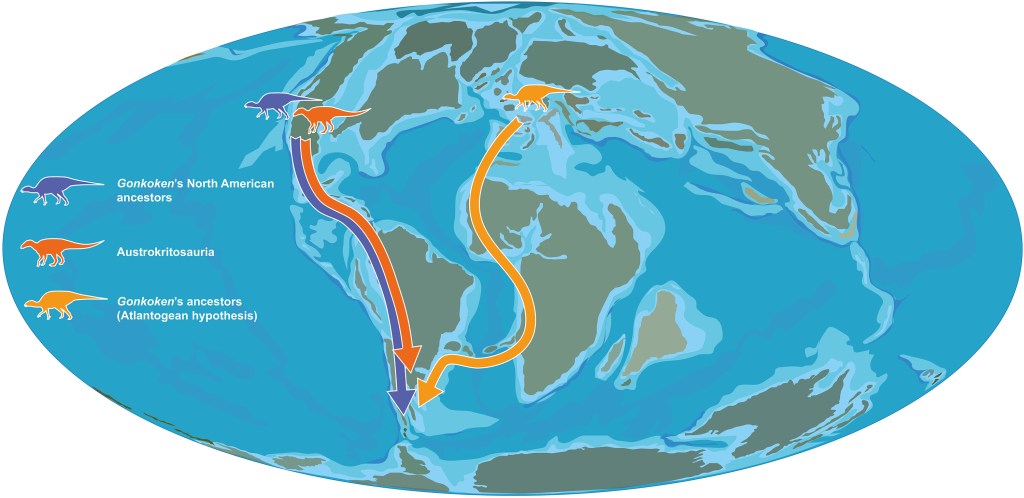 La position phylogénétique de Gonkoken est une énigme biogéographique car elle suppose que ses ancêtres proviennent soit d’Europe, soit d’Amérique du Nord. Ces deux trajets de dispersion sont longs et aucun genre d’hadrosauromorphe non-hadrosauridé n’a été découvert le long de ces trajets. Cela peut s’expliquer par un manque de fossiles collectés en Afrique et au nord de l’Amérique du Sud. Alarcón-Muñoz et ses collègues ont testé les deux hypothèses de trajet de dispersion dans une analyse biogéographique, qui soutient une origine nord-américaine pour les ancêtres de Gonkoken. Gonkoken est un hadrosauromorphe non-hadrosauridé survivant car au Maastrichtien, ils avaient déjà disparu en Amérique du Nord, suite à la concurrence avec les hadrosauridés. Pour Alarcón-Muñoz et ses collègues, c’est l’absence d’hadrosauridés dans le Chili subantarctique qui a permis son existence.