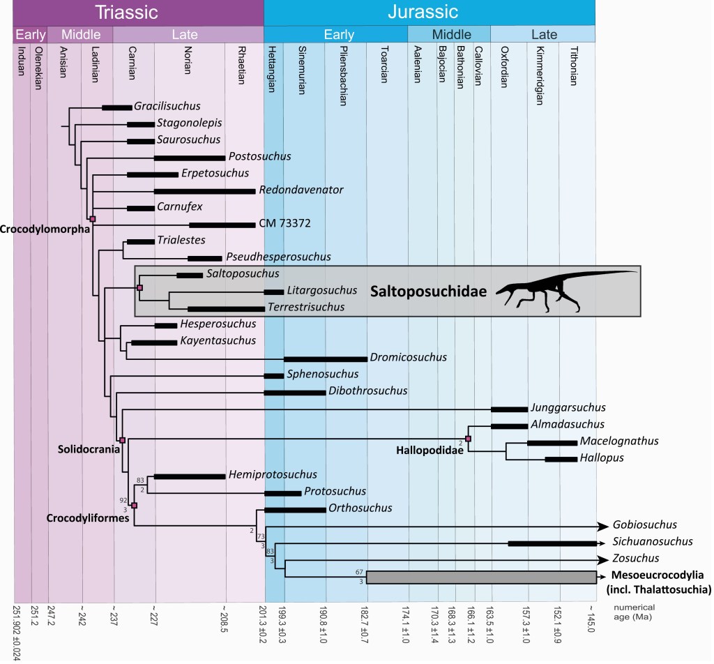 Spiekman fournit une description très détaillée de Saltoposuchus qui lui permet d’exclure définitivement toute idée de synonymie avec Terrestrisuchus. Cette description lui permet de tester dans une analyse phylogénétique l’impact qu’ont nouvelles données obtenues sur le classement de Saltoposuchus. Spiekman retrouve Saltoposuchus dans un clade de crocodylomorphes basaux avec Litargosuchus et Terrestrisuchus. Il définit ce clade comme représentant Saltoposuchidae et lui donne pour la première fois une définition. Ce clade de saltoposuchidés avait déjà été mis en évidence en 2017 par Leardi et ses collègues, mais nécessitait l’appui d’une redescription de Saltoposuchus pour confirmer son existence.