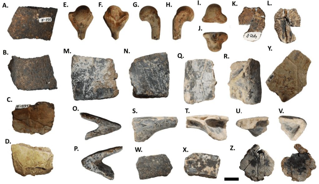 Le matériel décrit par Bogado et ses collègues comprend 6 plaques costales isolées (UFRJ-DG 346-R, UFRJ-DG 347-R, UFRJ-DG 357-R, UFRJ-DG 435-R, UFRJ-DG 712-R et UFRJ-DG 436-R), 3 plaques périphériques isolées (UFRJ-DG 360- R, UFRJ-DG 711-R et UFRJ-DG 443-R), trois plaques neurales isolées (UFRJ-DG 441-R, UFRJ-DG 715-R et UFRJ-DG 718-R), 5 fragments de plastron (UFRJ-DG 489-R, UFRJ-DG 713-R, UFRJ-DG 716-R, UFRJ-DG 720-R et UFRJ-DG 721-R), l’extrémité proximale d’un humérus gauche (UFRJ-DG 710-R), l’extrémité proximale d’un fémur gauche (UFRJ-DG 395-R), une scapula gauche partielle (UFRJ-DG 445-R) et deux fragments de carapace indéterminés (UFRJ-DG 706-R et UFRJ-DG 717- R). Tous ces spécimens sont trop fragmentaires pour être identifiés avec précision, et ont été référés à Testudines indet. par Bogado et ses collègues. Bogado et ses collègues ont également décrit de nouveaux spécimens de Roxochelys (voir cet article).