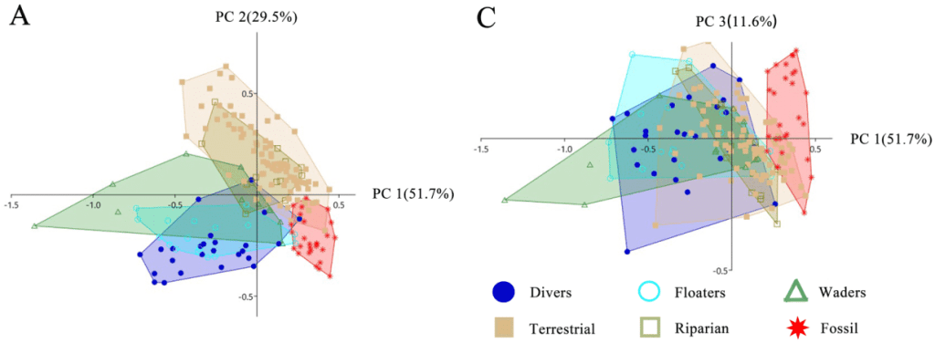 La très bonne préservation des plumes de la formation géologique de Zhonggou a permis à Zhang et ses collègues d’analyser leur microstructure. Ils ont pour cela réalisé des mesures, ensuite comparées à celles prises sur des plumes d’oiseaux actuels dans des analyses morphométriques. Zhang et ses collègues constatent que malgré une macrostructure très similaire à celle des plumes des oiseaux actuels, la microstructure des plumes de la formation géologique de Zhonggou est différente. En effet, ces plumes occupent un morphospace distinct de tous les autres morphospaces représentant les plumes des oiseaux actuels. Au sein des plumes décrites par Zhang et ses collègues, des différences de microstructure peuvent indiquer que plusieurs taxons de théropodes sont représentés.