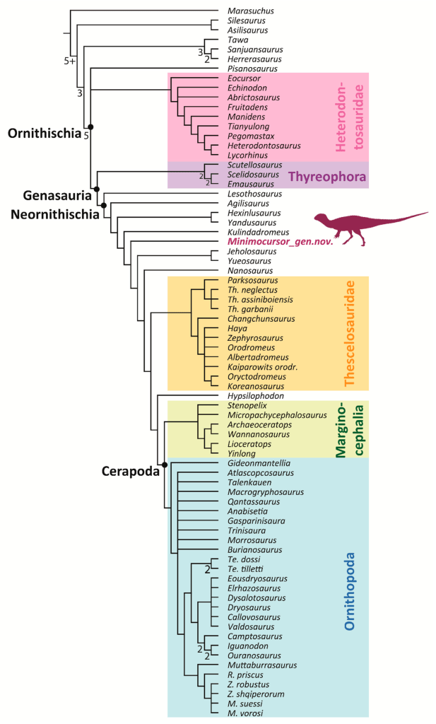 Manitkoon et ses collègues ont réalisé une analyse phylogénétique afin de connaître le classement de Minimocursor. Le genre a ainsi été classé au sein de Neornithischia, dans une position plus dérivée que les genres Heinxlusaurus, Agilisaurus et Kulindadromeus qui datent du jurassique moyen. En revanche, Minimocursor est plus basal que les les genres Nanosaurus, Jeholosaurus et Yueosaurus qui datent du jurassique supérieur et du crétacé inférieur. Ce classement de Minimocursor en tant que neornithischien basal est cohérent avec son âge ainsi qu’avec sa morphologie.