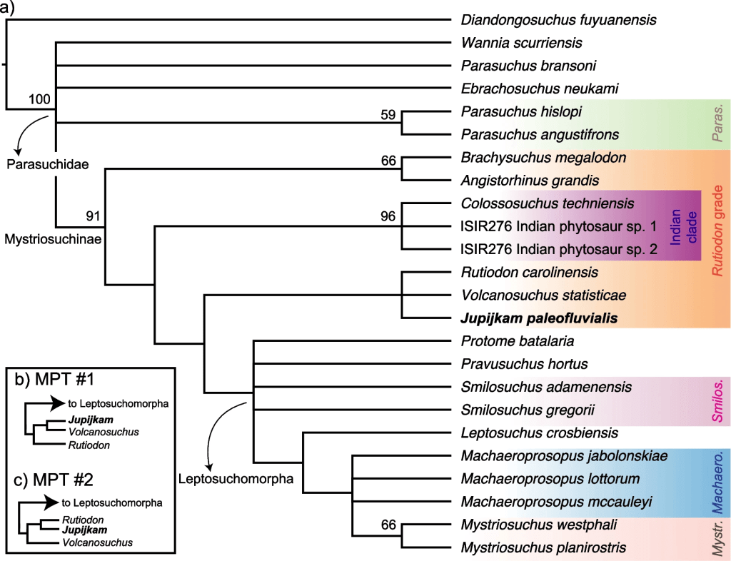 En 1974, Bob Salvia et A. Heimlich découvrirent les restes d’un phytosaure dans le Norien-Rhétien de la formation géologique de Blomidon (Nouvelle-Ecosse, Canada). En 1989, Olsen et ses collègues attribuèrent provisoirement le spécimen (YPM VPPU 007920) à Rutiodon sp., sans le décrire en détail. En 2015, Sues et Olsen revinrent sur cette attribution en notant le fait que le spécimen ne partageait aucune caractéristique unique à Rutiodon. Selon eux, il s’agissait d’un phytosaure indéterminé nécessitant une description détaillée. Brownstein décrit ainsi ce spécimen comme l’holotype du nouveau genre Jupijkam (en référence à Jupijkam, un serpent cornu de la mythologie Mi’kmaq, un peuple vivant en Nouvelle-Ecosse), avec J. paleofluvialis pour espèce.