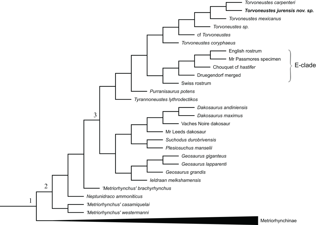 Girard et ses collègues ont réalisé une analyse phylogénétique pour connaître les relations de Torvoneustes jurensis avec les autres espèces de Torvoneustes. Il s’avère que T. jurensis est l’espèce-soeur de T. carpenteri, dans une position dérivée au sein du genre Torvoneustes. Girard et ses collègues retrouvent le genre Torvoneustes dans un clade avec Tyrannoneustes, Purranisaurus et des taxons sans nom, au sein de Geosaurini. Torvoneustes est ainsi retrouvé dans une position identique à celle retrouvée par les analyses les plus récentes des relations des genres de metriorhynchidés.