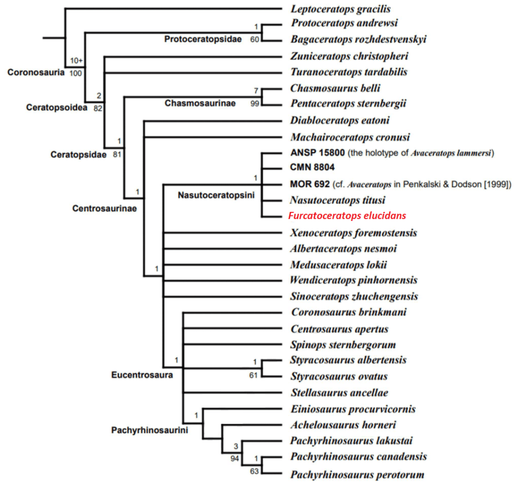 Référence : Ishikawa, H.; Tsuihiji, T.; Manabe, M., 2023, Furcatoceratops elucidans, a new centrosaurine (Ornithischia: Ceratopsidae) from the upper Campanian Judith River Formation, Montana, USA. Cretaceous Research. 105660.