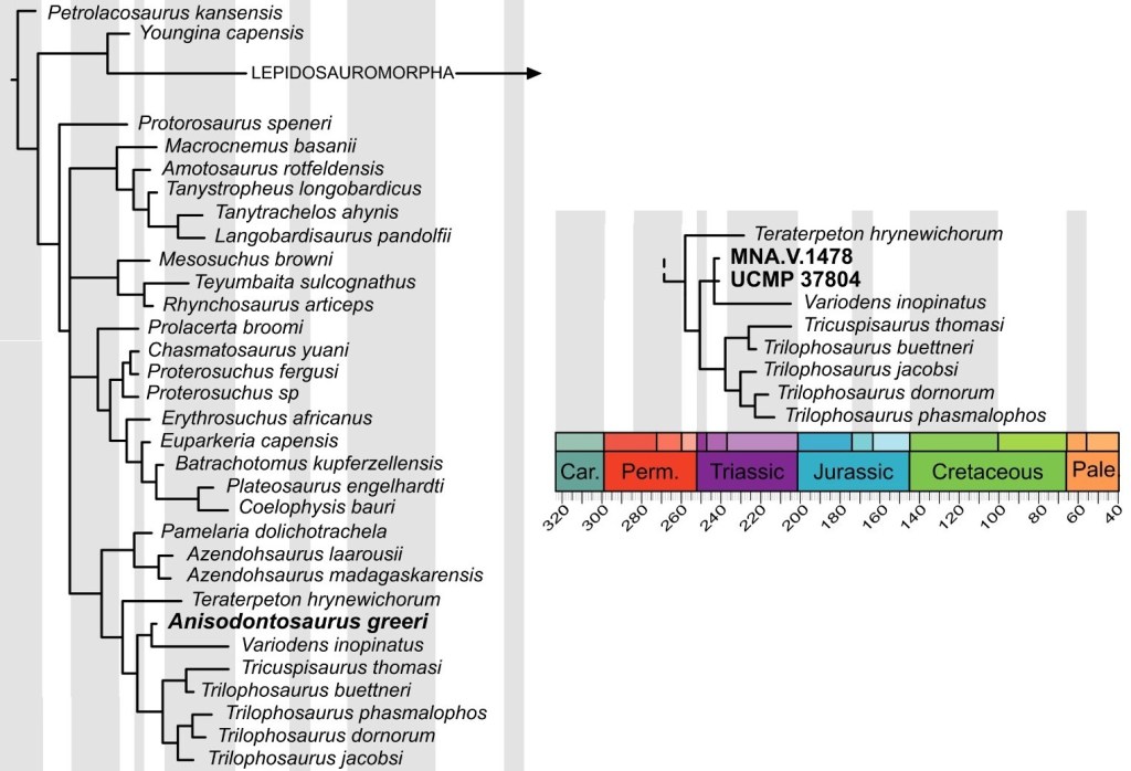 Références : Foffa, D.; Nesbitt, S.J.; Kligman, B.T.; Butler, R.J.; Stocker, M.R., 2023, New specimen and redescription of Anisodontosaurus greeri (Moenkopi Formation: Middle Triassic) and the spatiotemporal origins of Trilophosauridae. Journal of Vertebrate Paleontology.