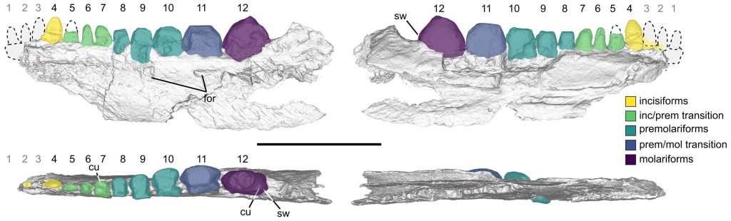 Anisodontosaurus est un genre d’archosauromorphe trilophosauridé, décrit en 1947 par Welles avec A. greeri pour espèce. Il est connu d’un dentaire gauche partiel, qui est son holotype (UCMP 37804), et d’un maxillaire droit partiel (MNA.V.1478) référé à A. greeri par Nesbitt en 2005. Ces deux spécimens proviennent de l’Anisien de la formation géologique de Moenkopi (Arizona, Etats-Unis). Le classement d’Anisodontosaurus est longtemps resté flou, le genre étant considéré comme un membre de Sphenodontia, Pseudosuchia, Procolophonidae, Thecodontia ou encore Trilophosauridae. Les dernières études penchaient plutôt pour une attribution d’Anisodontosaurus à Trilophosauridae. Foffa et ses collègues redécrivent ainsi en détail Anisodontosaurus afin d’éclaircir son classement.