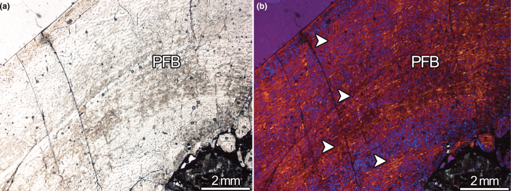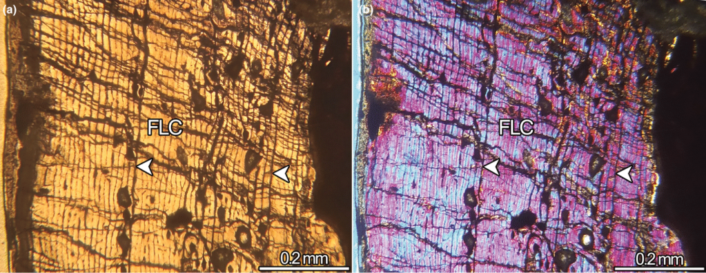 Référence : Ponce, D.A.; Scheyer, T.M.; Cerda, I.A.; Desojo, J.B., 2023, Palaeobiological inferences of “rauisuchians” Fasolasuchus tenax (Los Colorados Fm., Argentina) and Prestosuchus chiniquensis (Santa Maria Super sequence, Brazil) from the Middle–Upper Triassic of South America based on microstructural analyses. Journal of Anatomy.