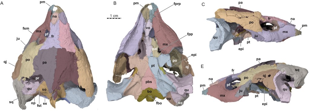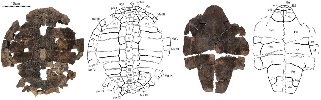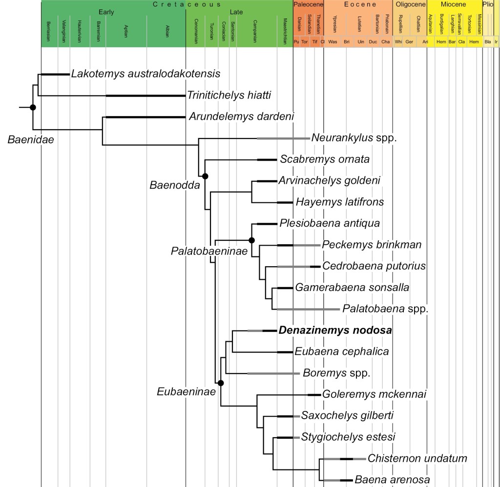 Références : Spicher, G.E.; Sertich, J.J.W.; Girard, L.C.; Joyce, W.G.; Lyson, T.R.; Rollot, Y., 2023, A description of a Denazinemys nodosa specimen (Testudinata, Baenidae) from the Late Cretaceous Kaiparowits Formation of southern Utah. Fossil Record. 26(2): 151-170.