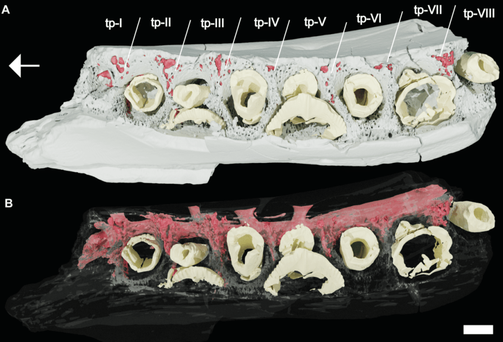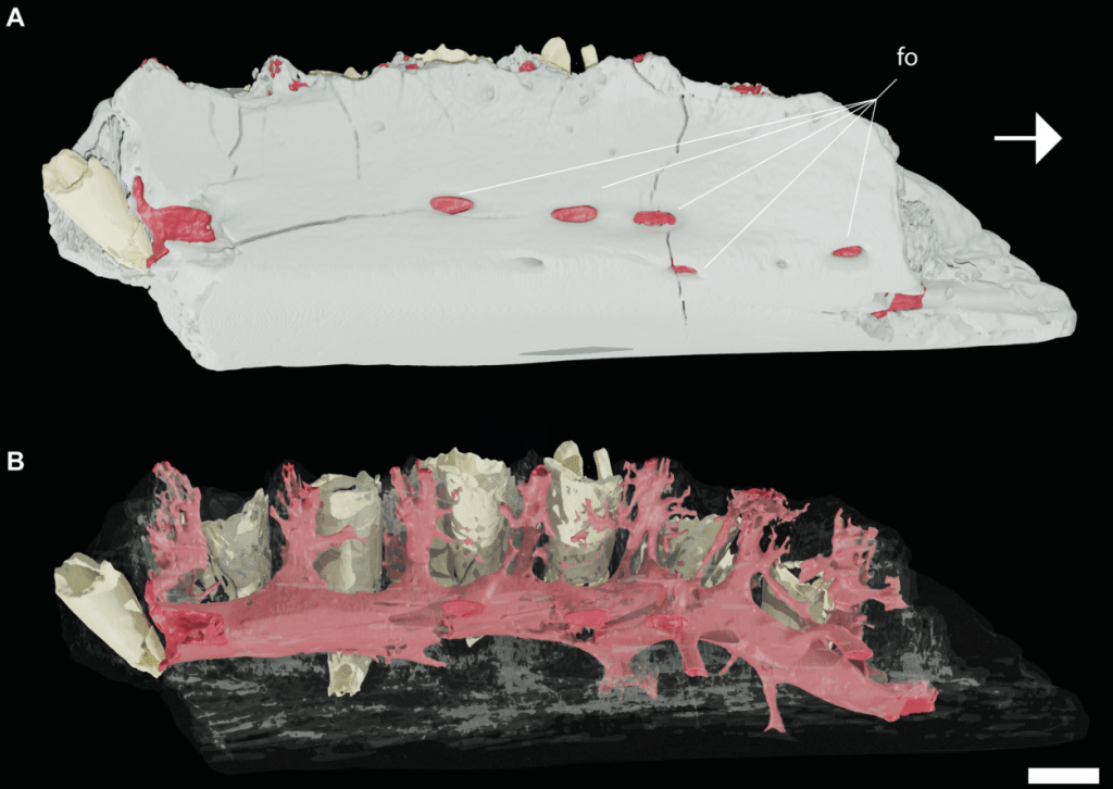 Références : Rotatori, F.M.; Quaranta, M.; Bertozzo, F.; Hübner, T.; Camilo, B.; Mateus, O.; Moreno-Azanza, M., 2023, Hadrosaur-like vascularisation in the dentary of an early diverging iguanodontian dinosaur. Historical Biology.