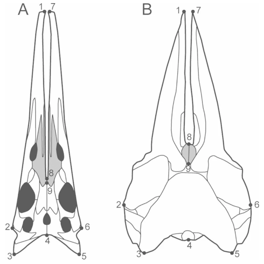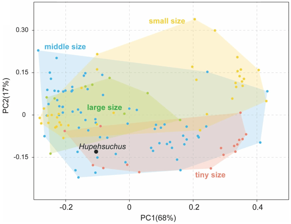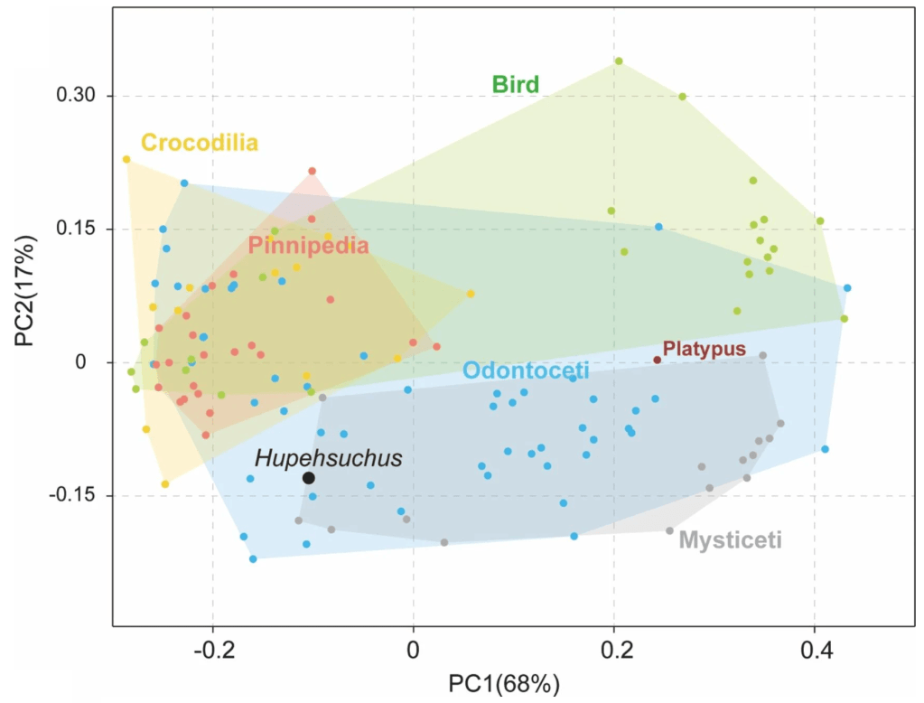 Fang et ses collègues ont réalisé une analyse morphométrique afin de comparer cette morphologie atypique avec des genres actuels. Il s’avère que le crâne de Hupehsuchus se situe dans le morphospace des baleines actuelles (mysticètes et odontocètes). Cela n’est pas surprenant, notamment avec la fente séparant les prémaxillaires de Hupehsuchus qui se retrouve chez les baleines. Fang et ses collègues ont donc cherché à savoir si Hupehsuchus aurait pu chasser des proies par filtration.