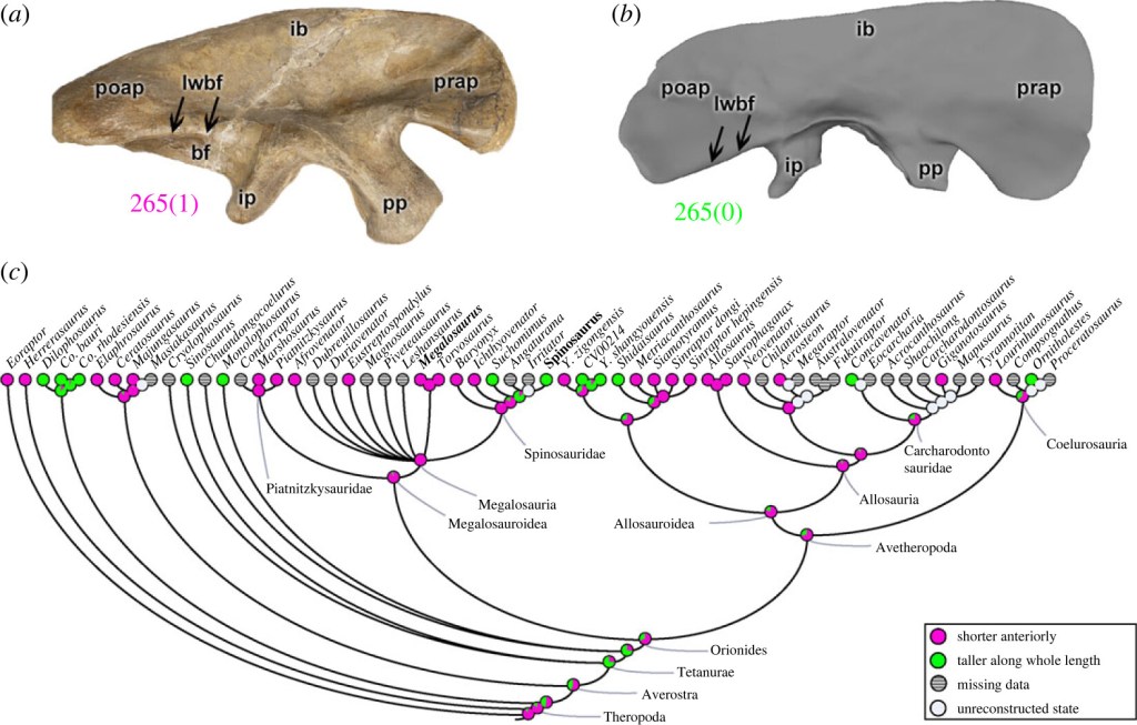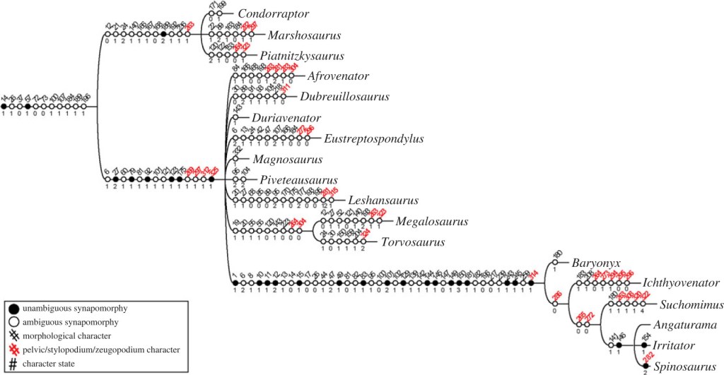 Lacerda et ses collègues ont étudié le bassin (ilium, pubis et ischium), le fémur, le tibia et la fibula des megalosauroidés pour lesquels ces os sont connus. Ils ont ainsi obtenu des résultats afin de réaliser une analyse phylogénétique. Cette analyse leur a permis de noter l’évolution des caractères au sein de Megalosauroidea. Lacerda et ses collègues ont retrouvé un Megalosauroidea classique, à l’exception du fait que Baryonychinae et Megalosauridae y sont paraphylétiques. Ces différences peuvent s’expliquer par le fait que d’autres espèces qui ne sont pas connues par leur bassin et leurs membres postérieurs n’ont pas été prises en compte.