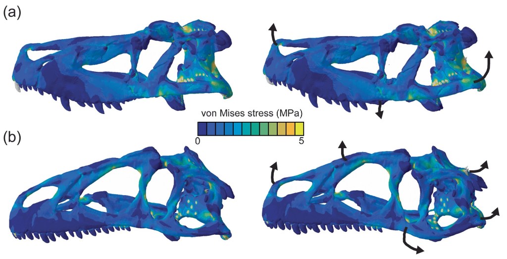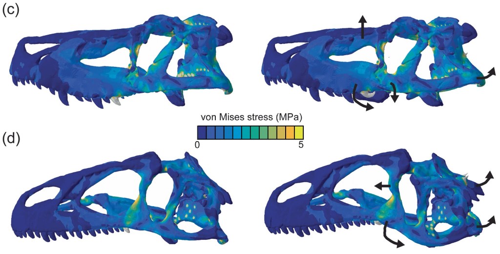 Les comparaisons entre Saurosuchus et Allosaurus montrent une certaine convergence, mais aussi plusieurs différences notables. Les crânes des deux genres montrent une certaine résistance aux stress lors d’une morsure, et des distributions de stress globalement similaires. Cependant, la moitié antérieure du crâne d’Allosaurus est nettement plus solide mécaniquement que celle de Saurosuchus. De plus, la force de morsure postérieure de d’Allosaurus (environ 3500 N) est bien supérieure à celle de Saurosuchus, alors qu’Allosaurus est lui-même considéré comme un théropode à la morsure faible. La forme rectangulaire du crâne de Saurosuchus, la morphologie de ses prémaxillaires et des ses vomers l’auraient rendu plus sensible aux contraintes qu’Allosaurus, qui avait un crâne aux extrémités arrondies et une morphologie différente des prémaxillaires et des vomers.