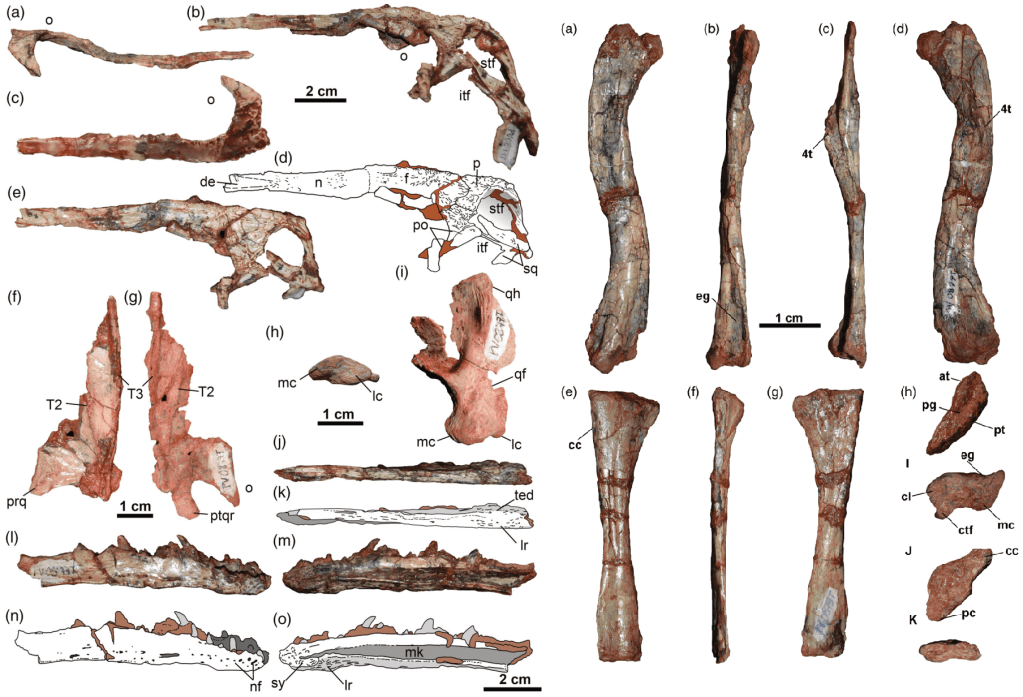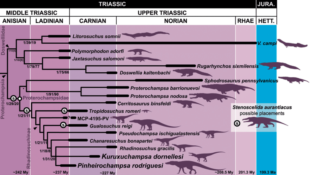Références : Paes-Neto, V.D.; Lacerda, M.B.; Ezcurra, M.D.; Raugust, T.; Trotteyn, M.J.; Soares, M.B.; Schultz, C.L.; Pretto, F.A.; Francischini, H.; Martinelli, A.G., 2023, New rhadinosuchine proterochampsids from the late Middle-early Late Triassic of southern Brazil enhance the diversity of archosauriforms. The Anatomical Record.