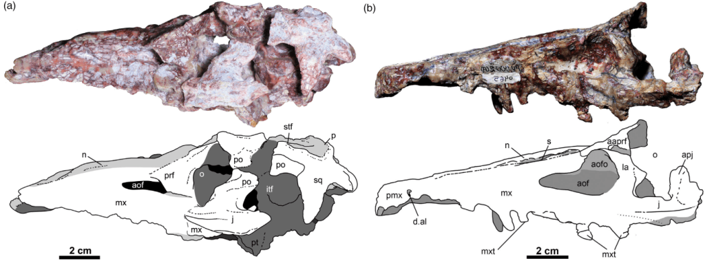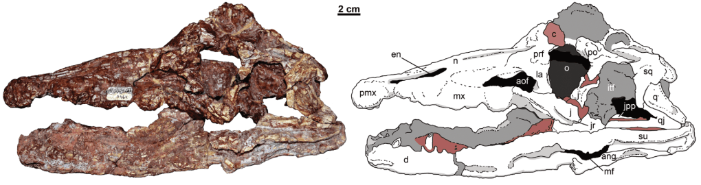 Références : Paes-Neto, V.D.; Lacerda, M.B.; Ezcurra, M.D.; Raugust, T.; Trotteyn, M.J.; Soares, M.B.; Schultz, C.L.; Pretto, F.A.; Francischini, H.; Martinelli, A.G., 2023, New rhadinosuchine proterochampsids from the late Middle-early Late Triassic of southern Brazil enhance the diversity of archosauriforms. The Anatomical Record.