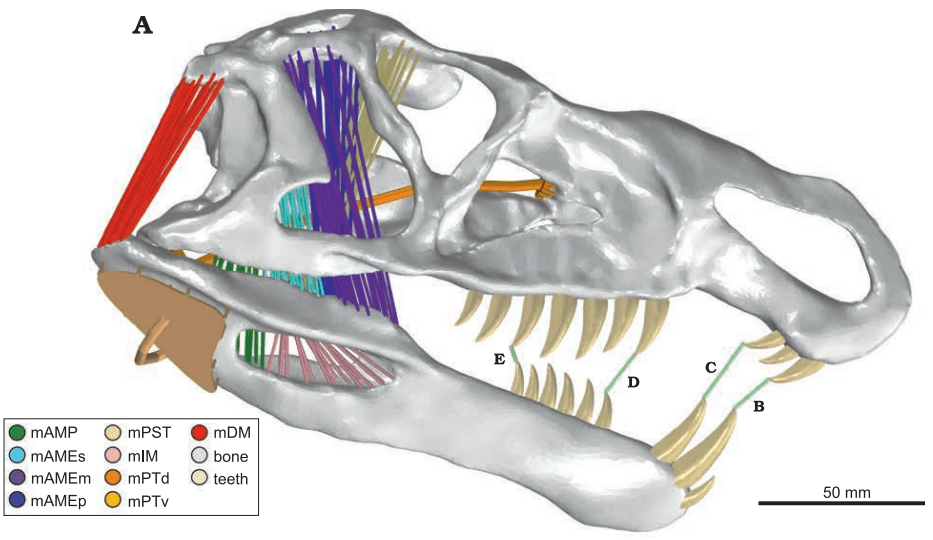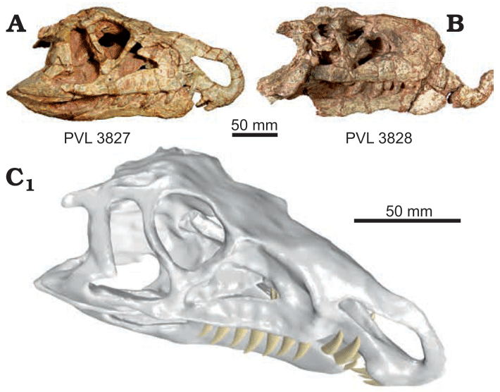Référence : Taborda, J.R.A.; Belen von Baczko, M.; Desojo, J.B., 2023, Biomechanical analysis and new trophic hypothesis for Riojasuchus tenuisceps, a bizarre-snouted Late Triassic pseudosuchian from Argentina. Acta Palaeontologica Polonica. 68.