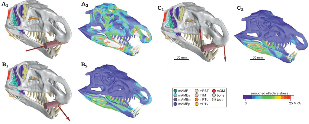 Riojasuchus est un genre de pseudosuchien ornithosuchidé connu du Norien de la formation géologique de Los Colorados (San Juan, Argentine). Il se caractérise, comme les autres ornithosuchidés, par des membres relativement longs et un crâne de prédateur. Les analyses précédentes de l’écologie alimentaire des ornithosuchidés ont suggéré qu’ils se nourrissaient, suivant les études, de proies rapides, de tous types de proies ou bien de charognes. Taborda et ses collègues analysent ainsi la biomécanique du crâne de Riojasuchus afin d’apporter un éclaircissement sur l’écologie alimentaire de ce genre.