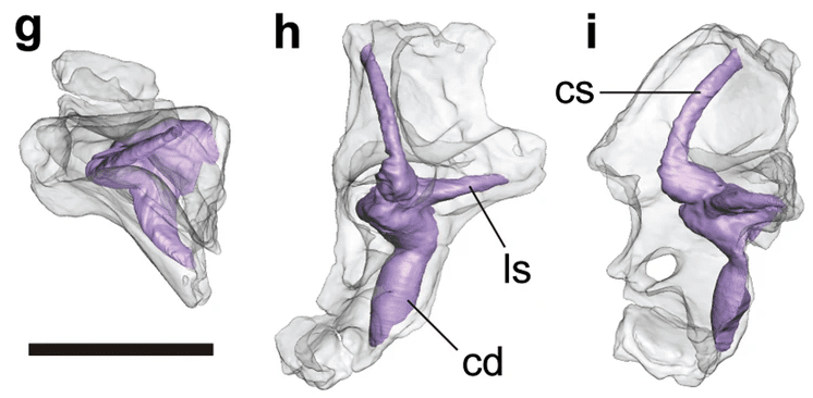 La boîte crânienne partielle de l’holotype (FPDM-V-11311) de Tyrannomimus fukuiensis a été analysée par Hattori et ses collègues. Ils en ont effectué un scan CT afin d’en visualiser l’endocrâne et d’en modéliser l’endocaste. L’endocaste 3D ainsi obtenu a permis de révéler des détails sur la morphologie de l’oreille interne de Tyrannomimus. Hattori et ses collègues constatent que la longueur du canal cochléaire de Tyrannomimus est similaire à celle de celui de Struthiomimus. La longueur du canal cochléaire étant généralement liée à la fréquence auditive, Hattori et ses collègues suggèrent que l’ouïe de Tyrannomimus était similaire à celle de Struthiomimus.
