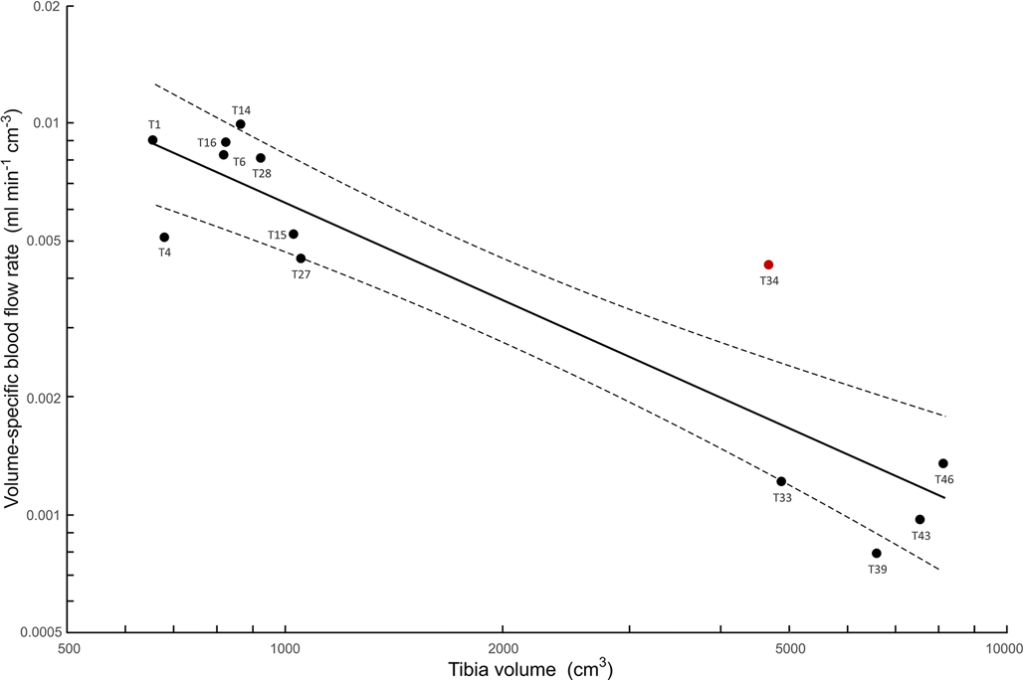 Seymour et ses collègues ont analysé 49 tibias de Maiasaura peeblesorum, provenant du Campanien de la formation géologique de Two Medicine (Montana, Etats-Unis). Ils représentent tous des individus différents formant une série ontogénique du stade juvénile au stade adulte. Sur ces 49 tibias, Seymour et ses collègues ont pu mesurer les foramens nutritifs de 13 tibias. Pour évaluer le flux sanguin à partir de la taille des foramens, ils ont utilisé un système d’équations. Les valeurs moyennes de débit sanguin osseux traversant le tibia (Q̇), de la longueur du tibia (L), de la circonférence médiane du tibia (C) et la robustesse (R) ont été analysées en relation avec la masse corporelle (M). Seymour et ses collègues ont ainsi analysé le modèle linéaire obtenu pour estimer le débit sanguin traversant le tibia de Maiasaura.
