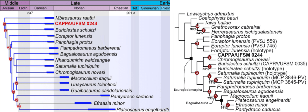 Les analyses phylogénétiques de Moro et ses collègues placent CAPPA/UFSM 0244 comme un sauropodomorphe basal proche de Buriolestes et de Mbiresaurus, ou bien proche de Buriolestes et de Chromogisaurus. Les comparaisons morphologiques montrent que CAPPA/UFSM 0244 partage plusieurs caractères autapomorphiques avec Buriolestes.