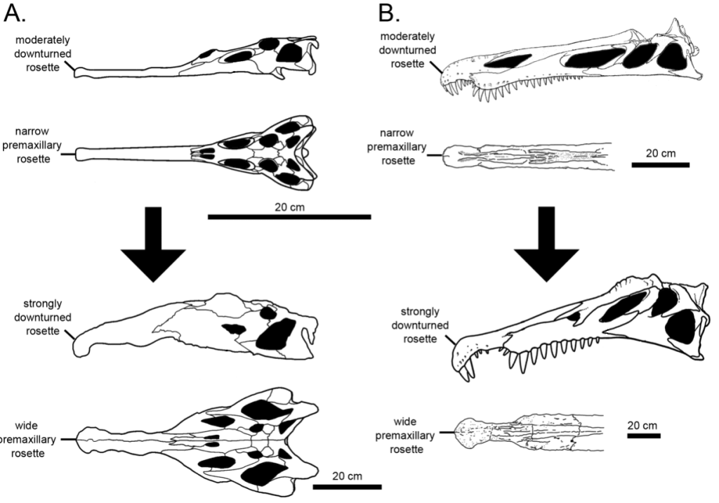 Les spinosauridés sont un groupe de dinosaure théropode qui partage un certain nombre de caractéristiques avec les crocodiliens actuels. Ces caractéristiques incluent des dents coniques à la surface cannelée, des rangées de dents sinusoïdales, un crâne allongé et un prémaxillaire élargi en une « rosette » portant de plus grandes dents. Ces ressemblances ont conduit les paléontologues à suggérer un cas de convergence évolutive entre les spinosauridés et les crocodiliens. Néanmoins, les crocodiliens présentent un crâne aplati dorsoventralement, alors que celui des spinosauridés est plutôt aplati latéralement comme celui des autres théropodes. De plus, la « rosette » des spinosauridés est orientée vers le bas, contrairement à celle des crocodiliens.