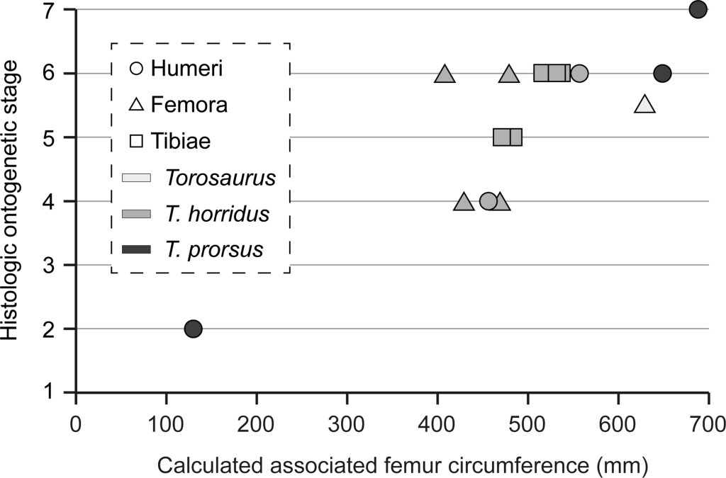 Au total, de Rooij et ses collègues ont identifié 8 stades de développement ontogénique pour Triceratops. Il s’agit des stades nouveau-né, jeune juvénile, vieux juvénile, jeune subadulte, vieux subadulte, adulte et adulte âgé. Toutefois, il est difficile de calculer l’âge des spécimens de Triceratops, car les lignes d’arrêt de croissance sur les os des membres sont difficiles à distinguer, notamment au niveau des premières années de la croissance. Ce cas se trouve également chez les grands sauropodes dérivés, et serait lié à des taux de croissance élevés. de Rooij et ses collègues notent que contrairement aux sauropodes dont l’âge peut se calculer grâce à l’ostéohistologie des côtes, les côtes de Triceratops préservent elles aussi très mal les lignes d’arrêt de croissance.