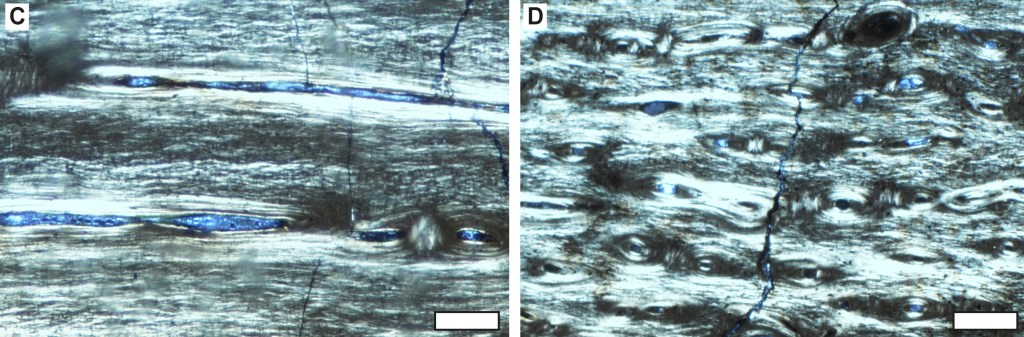Tout comme les sauropodes dérivés, Triceratops aurait ainsi eu un mode de croissance continu, avec très peu d’arrêts de croissance. Triceratops présente une autre similitude ostéohistologique avec les sauropodes dérivés. de Rooij et ses collègues ont observé la présence d’un tissu osseux particulier dans les os longs de Triceratops. Il s’agit d’un tissu osseux fibrolamellaire à fibres parallèles, un type de tissu qui a déjà été décrit chez des titanosaures comme Ampelosaurus et Magyarosaurus. La présence de ce tissu osseux particulier est notable, mais est encore difficile à expliquer.