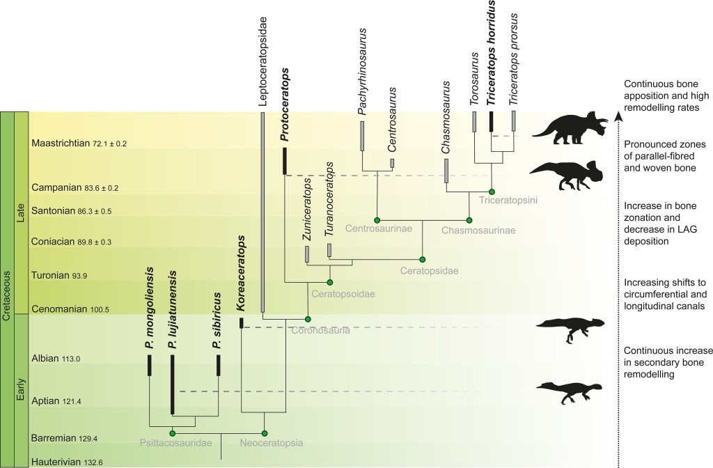 Etant donné le peu d’informations sur l’ostéohistologie des ceratopsidés, les donnés de de Rooij et ses collègues permettent d’en savoir plus sur l’évolution du mode de croissance des cératopsiens. Plusieurs caractéristiques ostéohistologiques de Triceratops sont relativement ancestrales, et se retrouvent déjà chez des cératopsiens basaux comme Koreaceratops ou Protoceratops. Un fort remodelage osseux s’observe déjà chez Psittacosaurus, et s’accentue au fil de l’évolution des cératopsiens. de Rooij et ses collègues constatent que tout au long de l’évolution des cératopsiens, une croissance de plus en plus continue a été développée, comme l’indique l’absence croissante de lignes d’arrêt croissance.