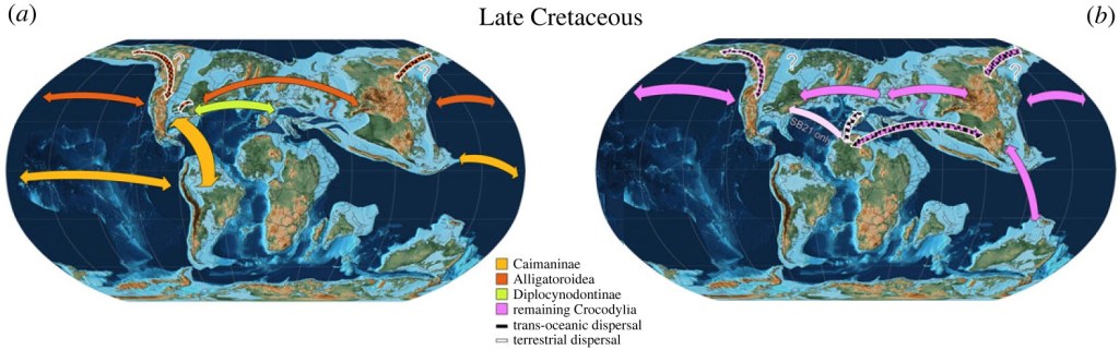 Groh et ses collègues ont traité les données fossiles selon la localisation spatio-temporelle et la position phylogénétique des taxons. Ils ont ensuite utilisé des modèles d’analyse biogéographique pour retracer les origines les plus probables de chaque clade d’après ces données. Groh et ses collègues remarquent que l’évolution de Neosuchia s’est principalement faite sur la base la dispersion. La vicariance (spéciation par l’apparition de barrières géographiques, ici la fragmentation de la Pangée) n’y a joué un rôle principal qu’au début de leur histoire évolutive, au jurassique.
