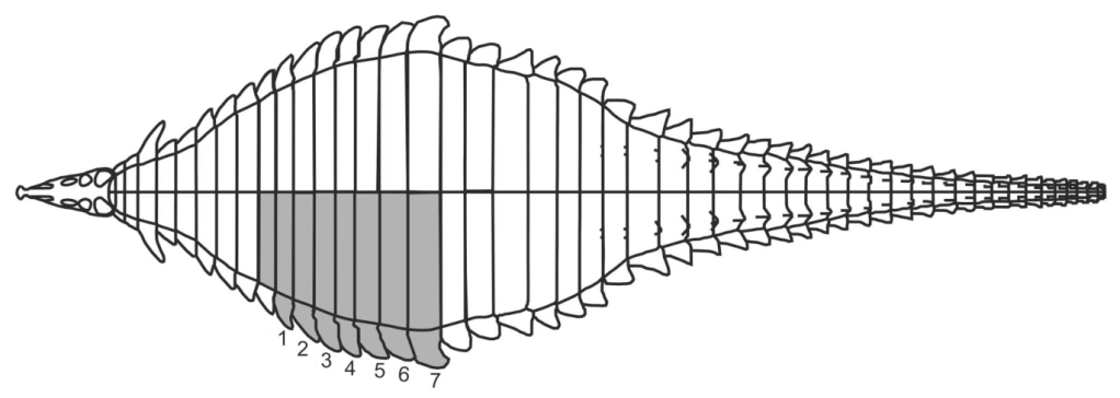 Les ostéodermes paramédians de Venkatasuchus ont une forme rectangulaire, tandis que les ostéodermes latéraux ont une forme de corne courbée vers l’arrière. Ils font partie d’une armure qui protégeait la colonne vertébrale, les flancs et le ventre de Venkatasuchus. Ce blindage constituait son moyen de défense principal contre les prédateurs ou lors de combats intraspécifiques.