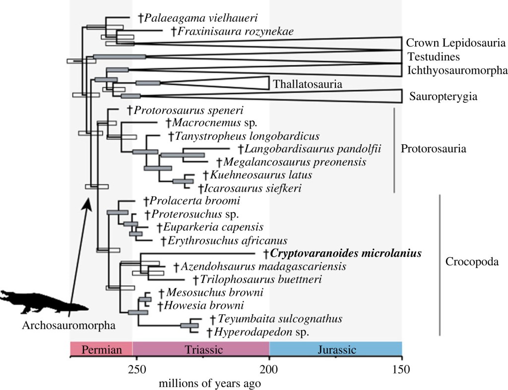 Références : Brownstein, C.D.; Simões, T.R.; Caldwell, M.W.; Lee, M.S.Y.; Meyer, D.L., Scarpetta, S.G., 2023, The affinities of the Late Triassic Cryptovaranoides and the age of crown squamates. Royal Society open science. 10(10): 230968.