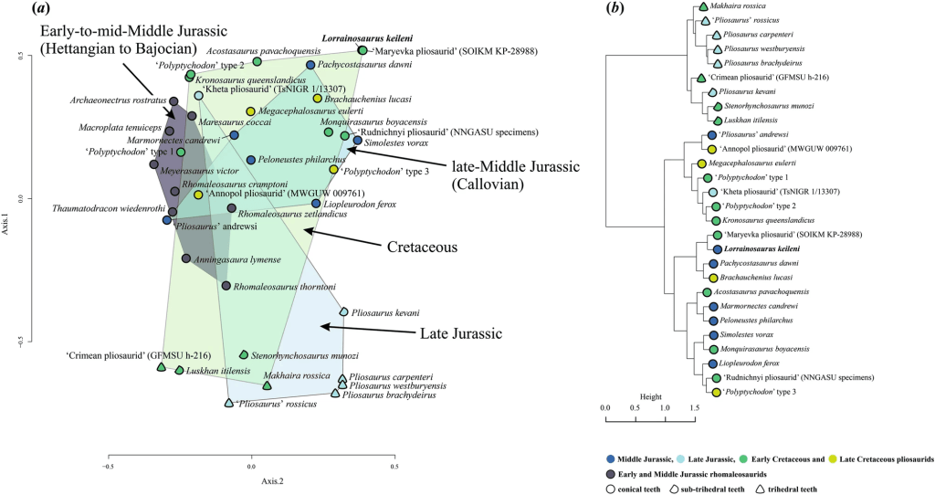Sachs et ses collègues ont également réalisé une analyse morphométrique des dents des pliosauroidés, afin de déterminer l’écomorphologie de Lorrainosaurus. Cela permet de savoir avec quels taxons Lorrainosaurus présente le plus de similitudes au niveau des dents, et donc au niveau de l’écologie alimentaire. Il en résulte que parmi les dents des pliosauridés, les dents de Lorrainosaurus ont une morphologie similaire à celles de Brachauchenius, Pachycostasaurus et un taxon sans nom (« Maryevka pliosaurid »). Ces quatre taxons possèdent des dents coniques, leur permettant de se nourrir de gros poissons et de petits sauropsides marins.
