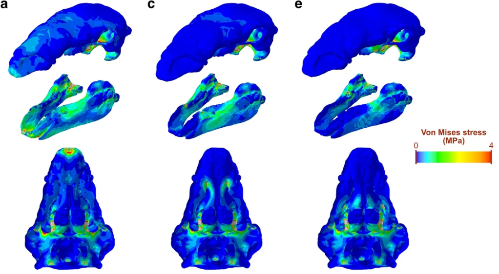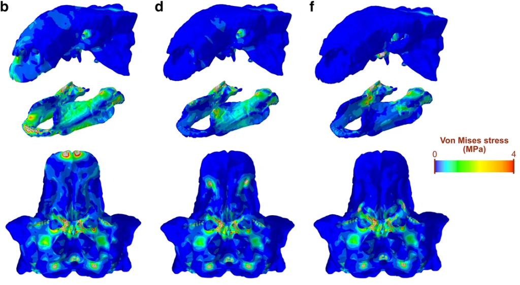 Ballell et ses collègues ont soumis les modèles 3D des crânes d’Euoplocephalus et de Panoplosaurus à la méthode d’analyse des contraintes de von Mises. L’application des contraintes de von Mises permet de connaître la résistance d’un objet lors d’une action, ainsi que son comportement biomécanique. Cette méthode permet de connaître les actions optimales au niveau biomécanique, indiquant quels mouvements Euoplocephalus et Panoplosaurus étaient susceptibles de faire ou de ne pas faire. Ballell et ses collègues ont utilisé les contrainte de von Mises dans les cas d’une morsure du bout de la mâchoire, d’une morsure antérieure et d’une morsure postérieure.