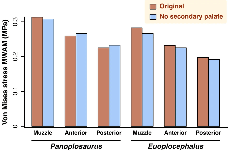 Les ankylosaures sont un groupe de dinosaures présentant un palais secondaire, une structure impliquée dans le renforcement du crâne contre le stress biomécanique des morsures mais aussi dans la résistance à la flexion du museau. Des études précédentes ont suggéré un rôle identique pour le palais secondaire des ankylosaures. Toutefois, le palais des ankylosaures permet également de cloisonner leur système de ventilation crânienne. Aucun avantage n’est donné par la présence du palais secondaire dans les analyses des contraintes de von Mises réalisées par Ballell et ses collègues. Ils en déduisent donc que le palais secondaire des ankylosaures n’avait pas de rôle d’avantage biomécanique.