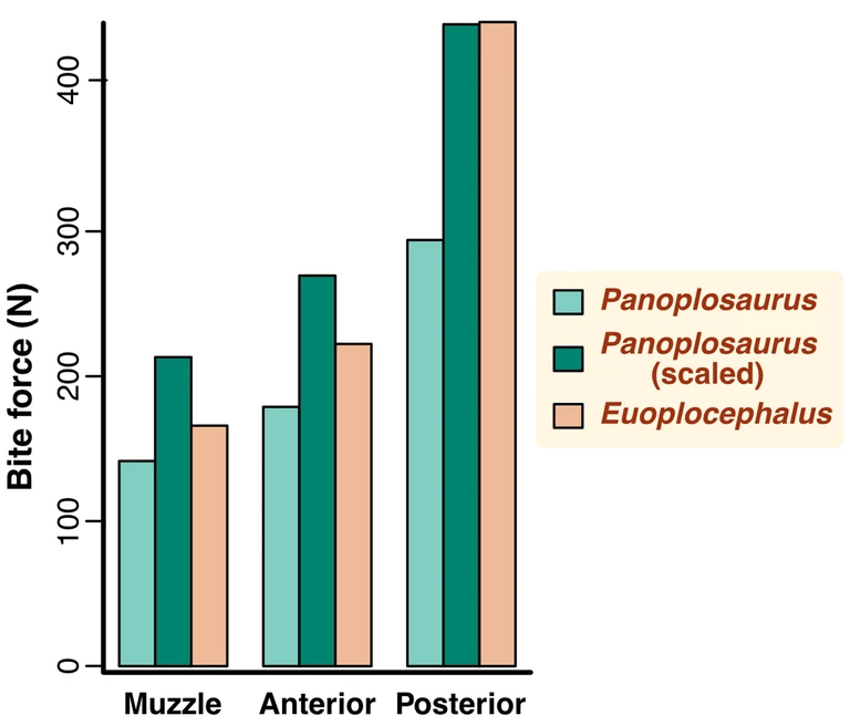 Ballell et ses collègues ont estimé que Panoplosaurus présente une force de morsure qui varie entre 141 et 294 N selon la localisation de la morsure sur les mâchoires. Pour Euoplocephalus, ces valeurs sont comprises entre 166 et 444 N. Bien que la morsure de Panoplosaurus soit plus faible que celle d’Euoplocephalus, celui-ci est plus petit que ce dernier. Lorsque les forces de morsure sont mises à l’échelle, Panoplosaurus présente une plus grande force de morsure par rapport à Euoplocephalus. La force de morsure de ces deux ankylosaures est proche de celle de Stegosaurus, mais plus faible que celle des cératopsiens ou des ornithopodes.