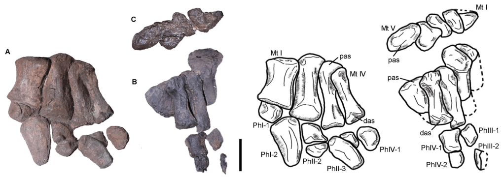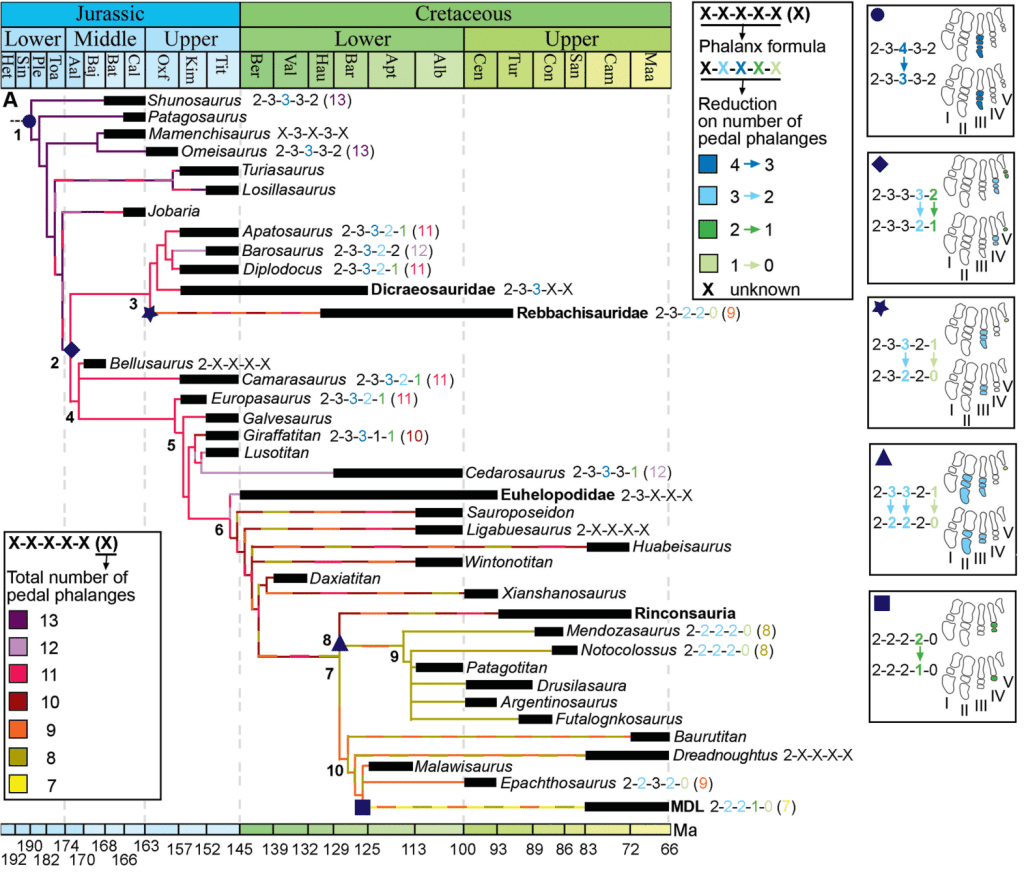 Grâce à MAU-Pv-EO-629, Bellardini et ses collègues reconstruisent ainsi pour la première fois la formule phalangienne complète d’un rebbachisauridé. La ressemblance de cette formule avec la formule phalangienne des titanosaures est marquée. Cela pourrait témoigner de la présence des mêmes pressions évolutives affectant les pieds de ces deux groupes. La nature de ces pressions reste encore floue, mais pourrait être liée à un meilleur soutien du corps avec un changement de la répartition du poids sur les pieds.