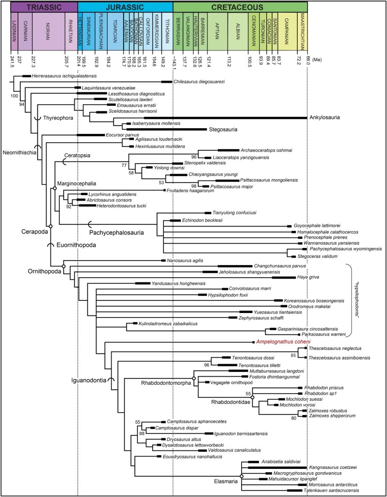 En 2021, Murray Cohen découvrit un morceau de mâchoire de petit ornithischien lors d’une prospection au bord du lac Grapevine, dans le Cénomanien de la formation géologique de Lewisville (Texas, Etats-Unis). L’analyse de ce spécimen révéla qu’il représente un nouveau taxon, que Tykoski et ses collègues baptisent Ampelognathus (« mâchoire du vignoble », en référence au nom de la localité-type de Grapevine), avec A. coheni pour espèce. L’holotype (DMNH 2021-05-02) d’Ampelognathus coheni est un dentaire gauche presque complet.