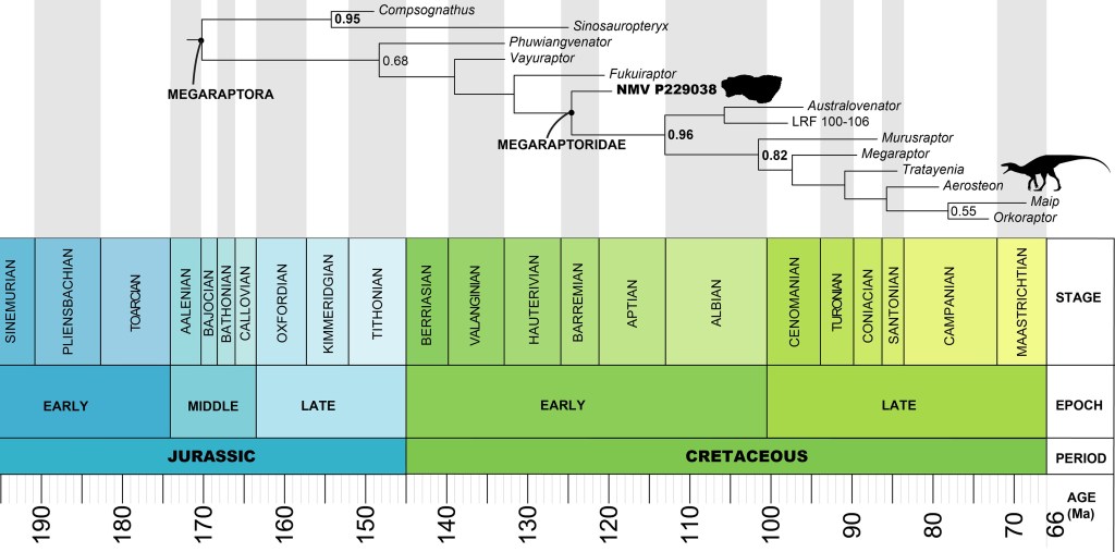 Le megaraptoridé NMV P229038 appartient probablement à un nouveau taxon. Les autres restes de megaraptoridés de la formation géologique de Wonthaggi sont potentiellement des restes du même taxon, mais il est impossible d’en être sûr. Le megaraptoridé NMV P229038 était un prédateur de petits dinosaures rapides, qui vivait dans une vallée fluviale bordée d’une chaîne de volcans. Il cohabitait avec des oiseaux, des ankylosaures, l’ornithischien énigmatique Serendipaceratops, plusieurs ornithopodes (dont Qantassaurus et Galleonosaurus) et un Megaraptora basal.