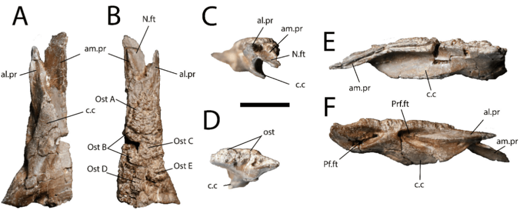 Le spécimen décrit par Hamilton et ses collègues est un frontal droit isolé (UALVP 59503). Ce frontal présente les caractéristiques typiques du frontal des Monstersauria, un groupe de squamates proches des varanoidés. UALVP 59503 possède 5 ostéodermes qui ne se chevauchent pas, approximativement polygonaux, sans carènes et fusionnés à l’os. Toutes ces caractéristiques permettent de confirmer son attribution à Monstersauria. Bien que l’holotype de Palaeosaniwa canadensis ne préserve pas de frontal, UALVP 59503 ressemble beaucoup au frontal d’un spécimen référé à cf. P. canadensis. Hamilton et ses collègues ont donc référé UALVP 59503 à cf. Palaeosaniwa canadensis.