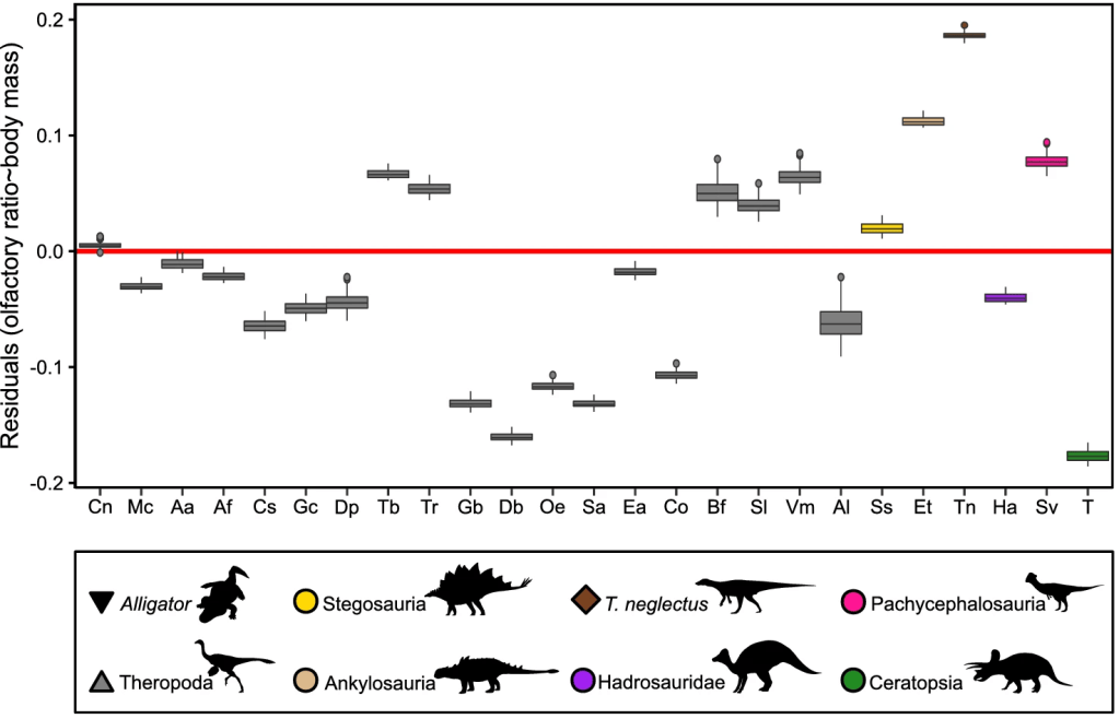 Le ratio olfactif de Thescelosaurus possède une valeur élevée, similaire à celle des oiseaux et des crocodiliens actuels, des ankylosaures et des théropodes prédateurs. Il est bien plus important que chez les ornithopodes ou les cératopsiens. En mettant ce ratio à l’échelle de la taille et de la masse de Thescelosaurus, il en résulte que son ratio olfactif est parmi les plus élevés mesurés chez les dinosaures. Button et Zanno en concluent que Thescelosaurus avait un odorat très développé, et qu’il s’agissait de la capacité sensorielle la plus importante chez lui.