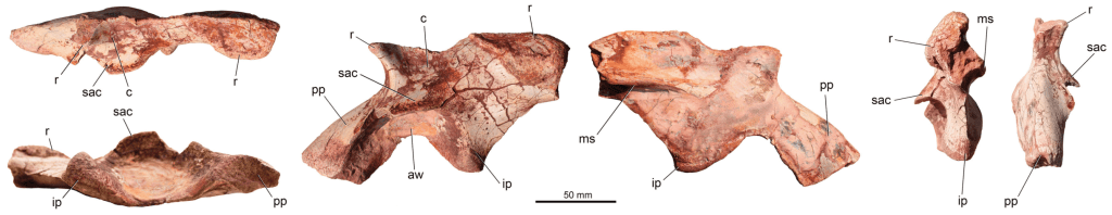 Référence : Garcia, M.S.; Cabreira, S.F.; da Silva, L.R.; Pretto, F.A.; Müller, R.T., 2023, A saurischian (Archosauria, Dinosauria) ilium from the Upper Triassic of southern Brazil and the rise of Herrerasauria. The Anatomical Record.