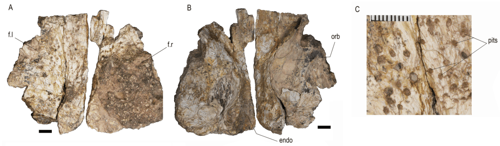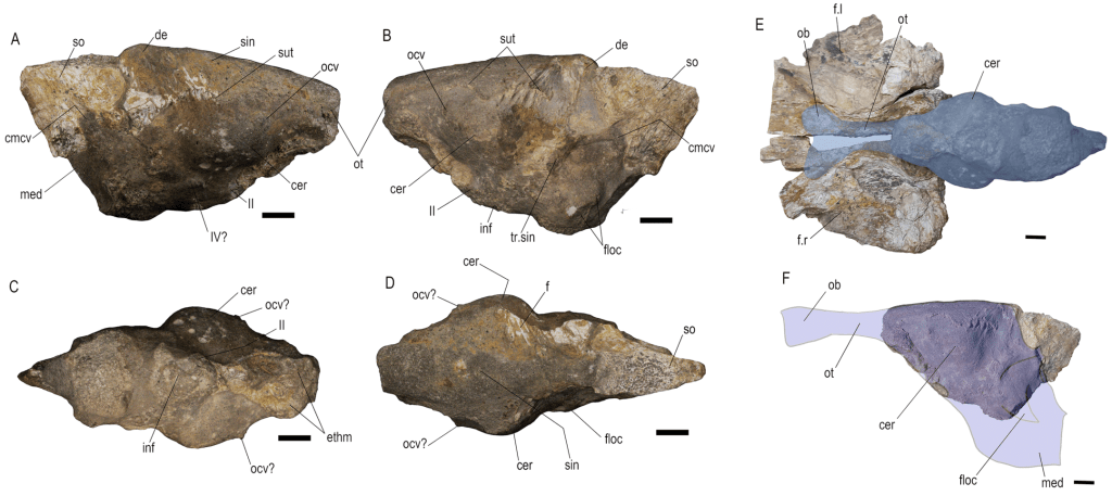 Référence : Paulina-Carabajal, A.; Ulloa-Guiaquin, K.; Filippi, L.S.; Méndez, A.H.; Lee, Y.-N., 2023, First record of an abelisaurid (Dinosauria, Theropoda) natural endocast, and comments on skull ornamentation. Windows into Sauropsid and Synapsid evolution. Essays in honor of Prof. Louis L. Jacobs. 130-139.